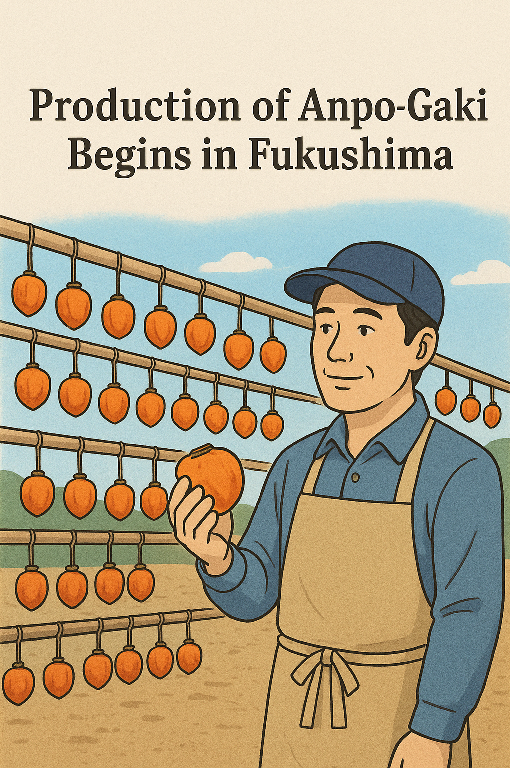 In Fukushima Prefecture’s Date City—known as the birthplace of Anpo-gaki, Japan’s beloved semi-dried persimmon—the annual production season has just begun. In the rural district of Yanagawa, farmer Yohei Shishido has started preparing this year’s harvest, filling his drying racks with rows of bright orange persimmons that signal the arrival of autumn.
