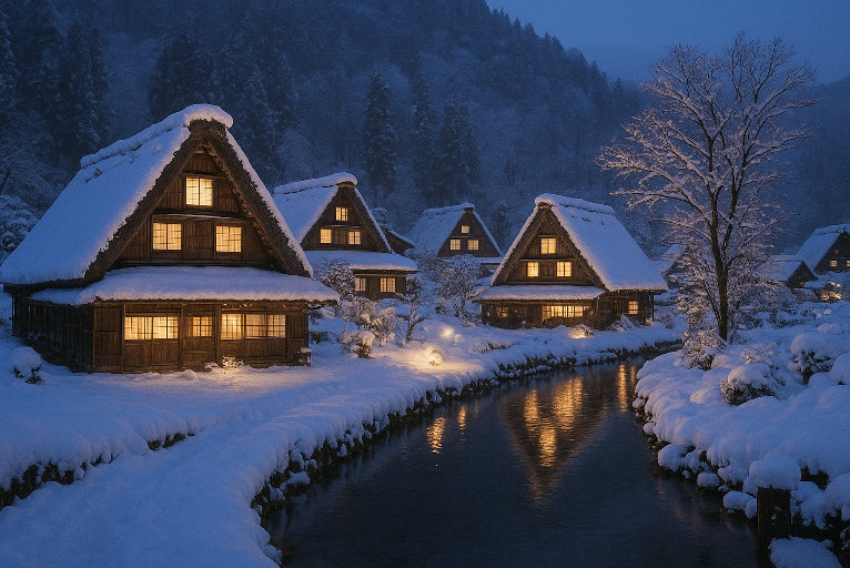 Shirakawa-go is especially magical in winter. When deep snow blankets the thatched rooftops, the entire village glows with a soft, fairytale-like beauty. During the famous winter illumination events, the houses are lit from below, casting warm golden light onto the snowy scene—a must-see for photographers and travelers seeking an unforgettable seasonal moment.