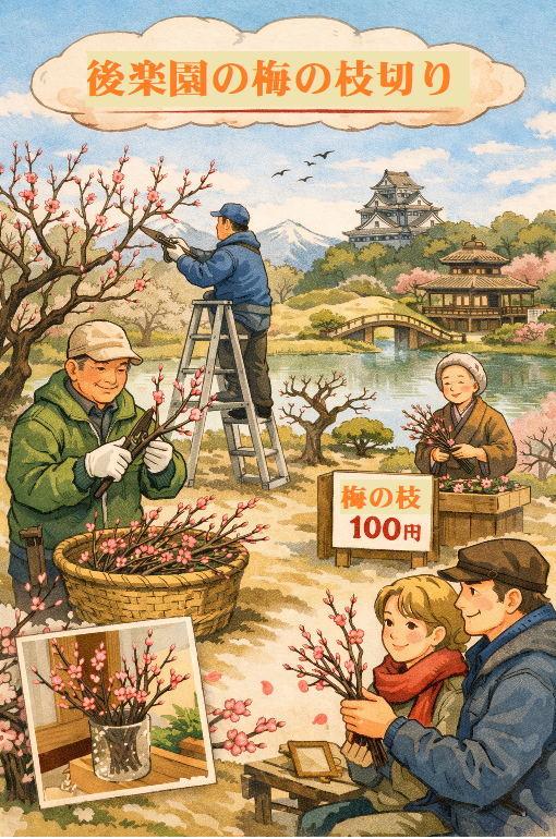 This quiet winter work may not be as spectacular as full bloom, but it plays a vital role in creating the elegant scenery Korakuen is known for. It also reflects a Japanese appreciation for nature—not only at its peak, but throughout every step of its seasonal preparation.